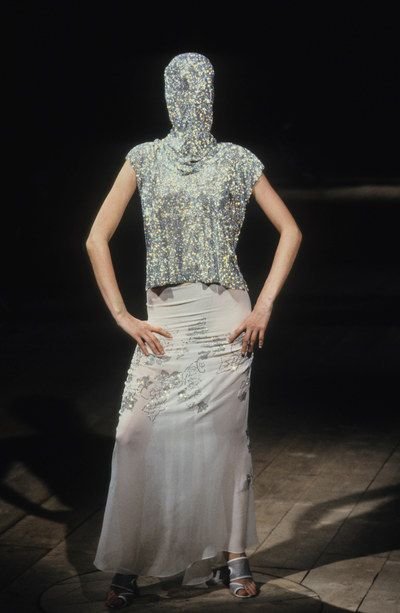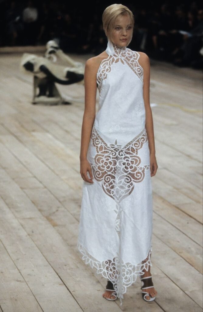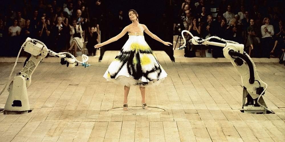 The Alexander McQueen 1999 spring show, called “No. 13”, was a pivotal fashion show staged during London Fashion Week in September of 1998. Its rise in popularity began with the merging of couture with performance art, and most famously, with its finale, featuring model Shalom Harlow being spray-painted by robots.