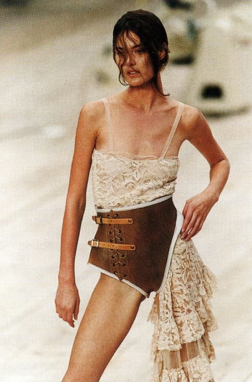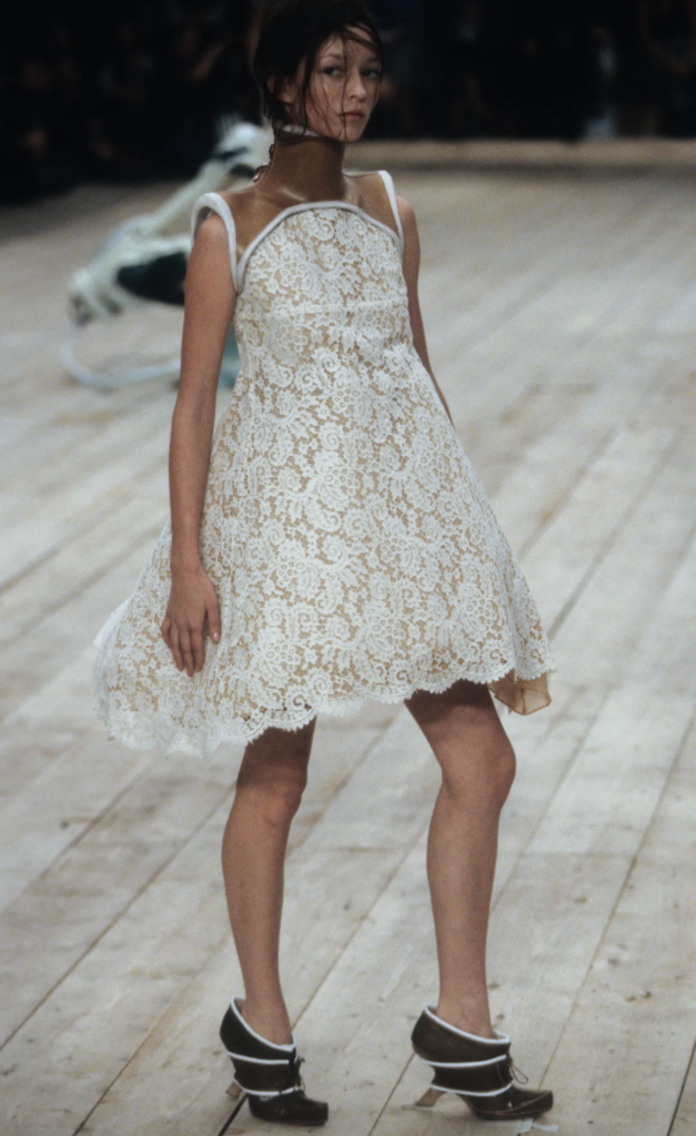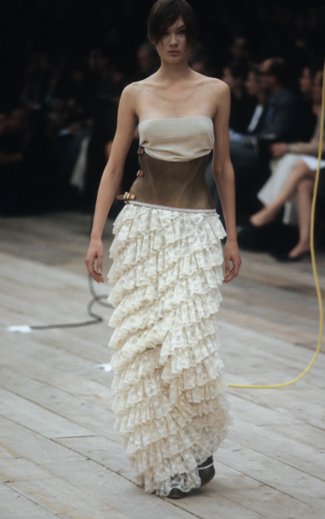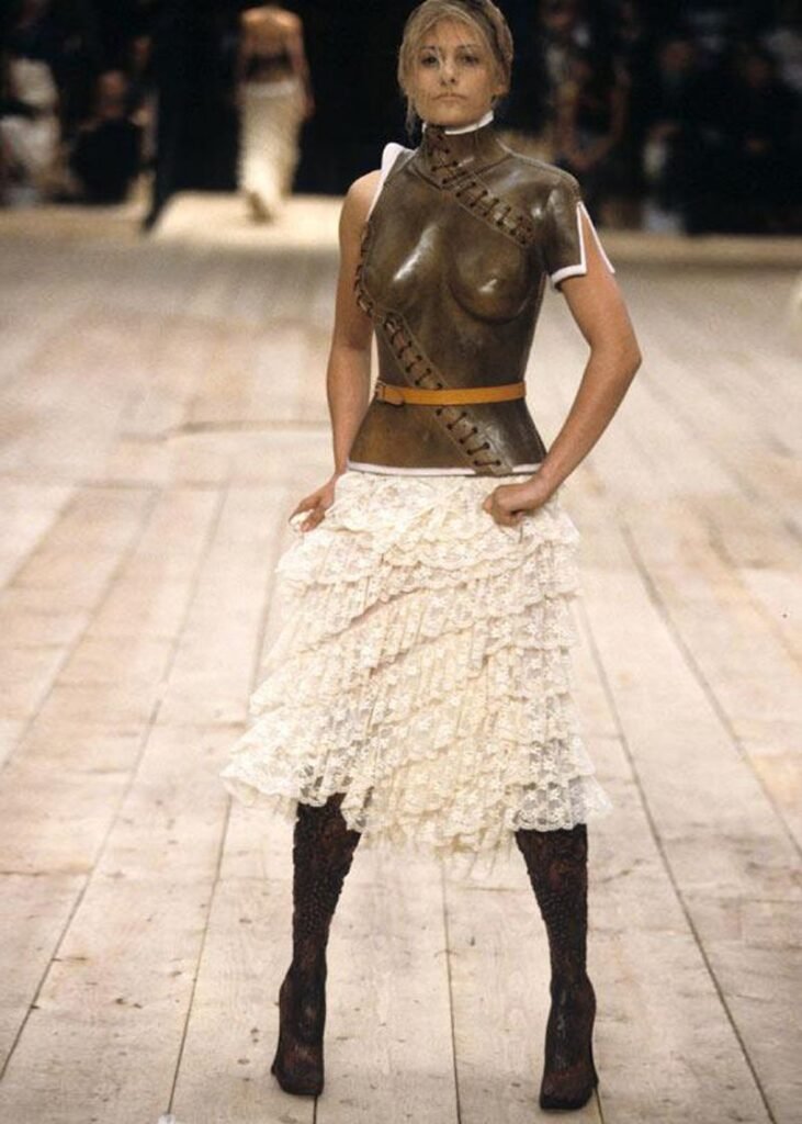 The collection featured sculptural tailoring, corsetry, lace, and prosthetics. Garments balanced Victorian romanticism with futuristic features. The contrast between the craftsmanship and machine process foreshadowed the fashion industry’s industrialised switch.