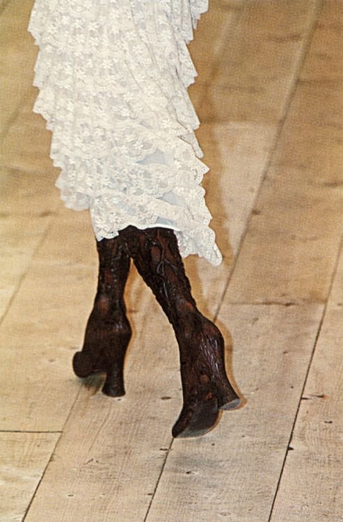 Paralympic athlete and double amputee Aimee Mullins opened McQueen’s 13th show wearing a Victorian-inspired prosthetic leg-boot, carved with intricate vines and leaves.